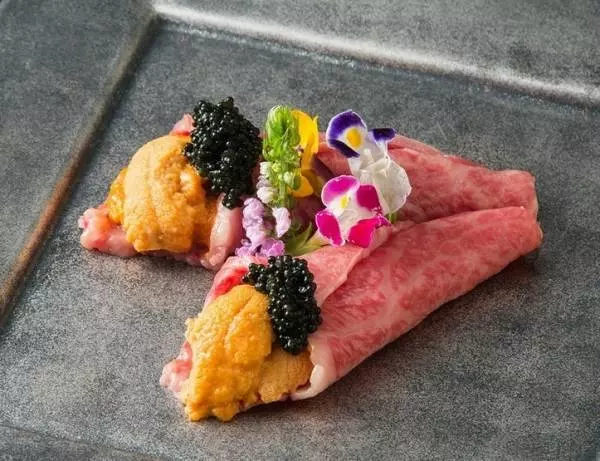 見た目も豪華な、【慶】オリジナルの『松阪牛の雲丹巻き』
