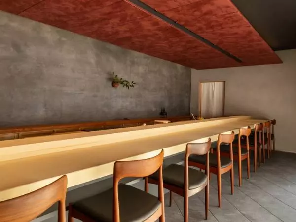 中洲川端駅から徒歩7分。シックな店構えが目を引く【鮨蒼天】は、一級建築士が手掛けたハイセンスな店内が特徴。ヨーロッパのビンテージチェアとヒバの一枚板を使ったカウンター、間接照明に照らされる盆栽など、モダンな設えの空間に和の雰囲気を絶妙にミックスしています。