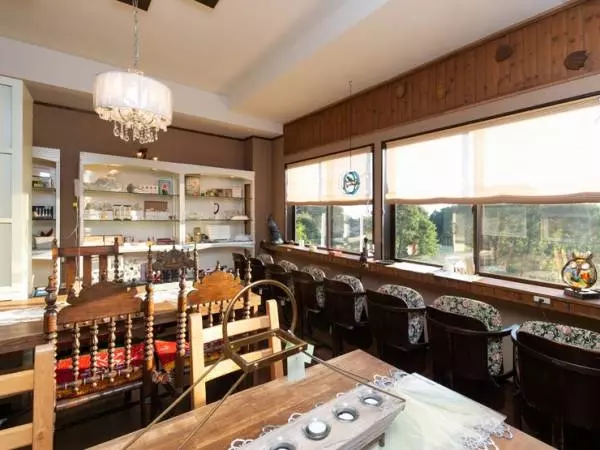 店主が惚れ込んだという自然の中にある洋館で過ごすひとときは格別。高台にあるため眼下に広がる風景も開放感たっぷりです。カウンター、テーブルはもちろん、気候のいい日にはテラス席でくつろぐのも魅力。併設されたテニスコートも使えるので、デートやファミリー、友達同士でのおでかけにオススメ。