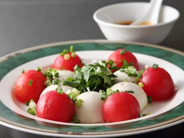 地元老舗の豆腐と鮮やかなトマトのコントラストも美しい『胡麻豆腐とトマトの冷菜』