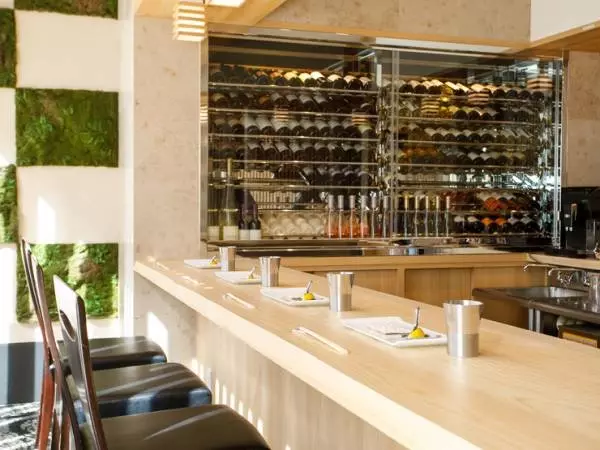 明るい白木の風合いがオシャレな店内、大型ワインセラーも映える