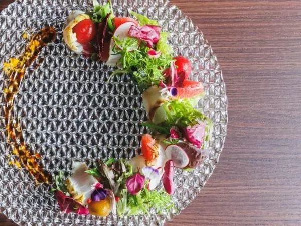 見た目にも鮮やかな『ターメリックでマリネした地魚の炙り~鎌倉野菜と柑橘のサラダ仕立て~』