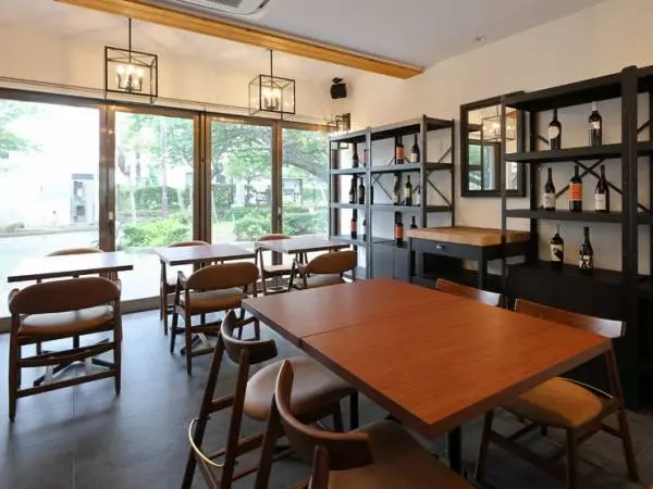 お店は大きく店名があしらわれた木製のプレートが目印。カリフォルニアワインがディスプレイされた店内には、ゆったりとテーブル席が配され、開放感抜群。カジュアルな普段使いにはもちろん、特別な日のランチやディナーにもぴったりのリラックス空間になっています。