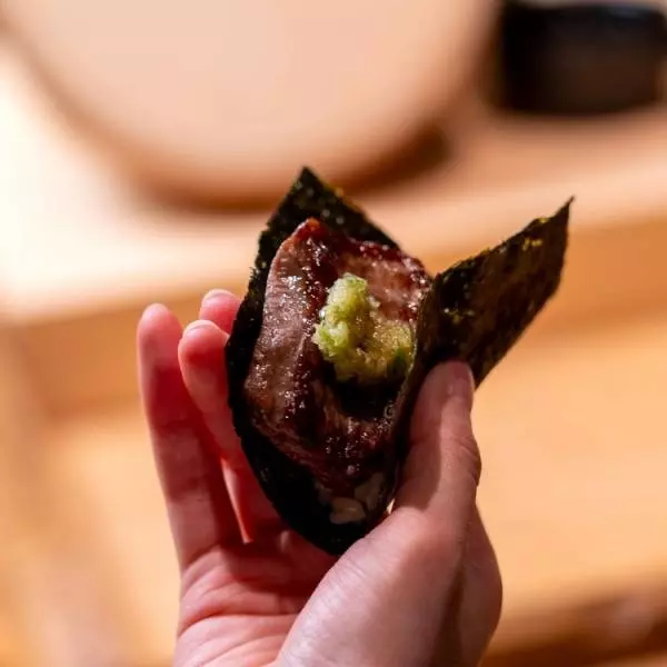 福島県産A5和牛の上質なサシの入ったサーロイン。まずは生のまま燻製にし、その後丁寧に炙った同店ならではの逸品。上質な脂がスモークの香りとともに口の中でとろけます。