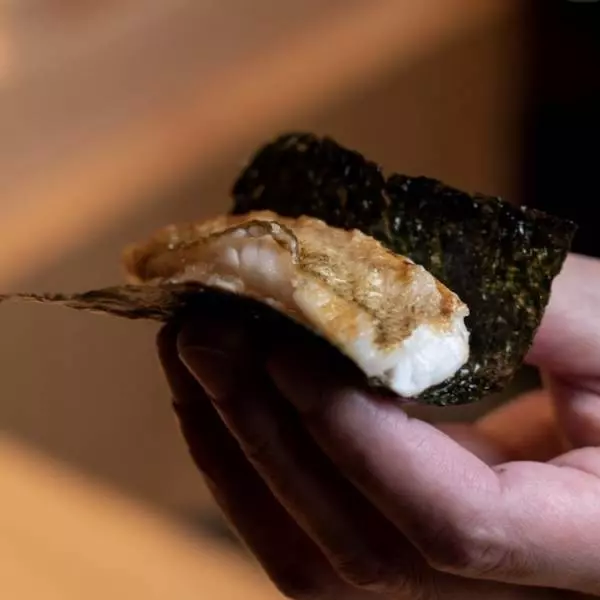 脂の旨みが滴るほどに丁寧に炙ったのどぐろを、シャリと海苔で包みながらいただく人気の高い逸品。ぷりぷりの食感も堪らない。