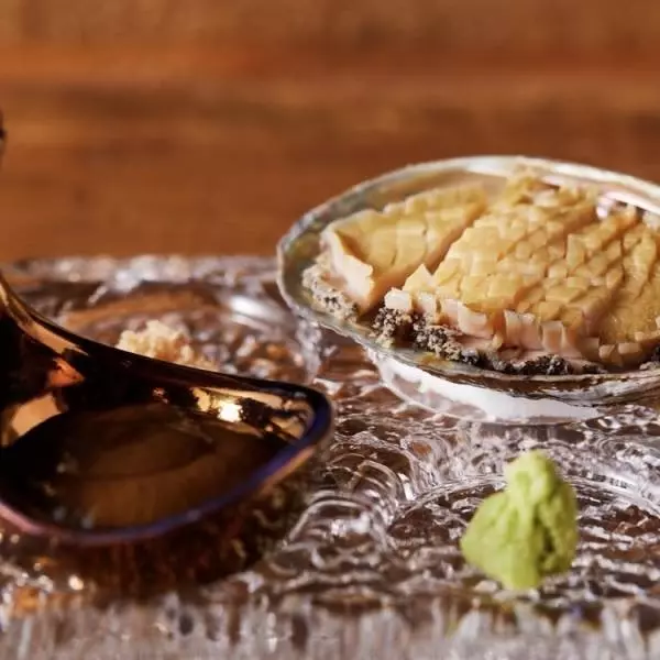 刺身にしたアワビを殻に盛り付け、アワビの肝と醤で作った肝ソース、本生わさび、竹炭塩で味の変化を楽しみながらいただく贅沢なひと品。
