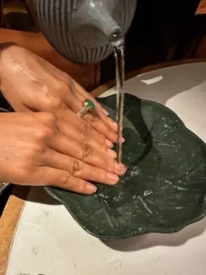 それから中庭を抜けてダイニング・エリアに移動し、そこでオーガニック・ハーブの水で手を洗います。これらは一連の儀式のようになっており、それぞれ嗅覚や触覚に潤いを与える構成になっています。