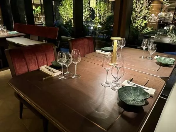 メインダイニングは広く、中庭を眺めながらゆっくりと食事ができるようになっています。アミューズは5種類です。それらが精進料理の五味五法(5つの味付け、5つの調理法)にのっとったスタイルで提供されます。