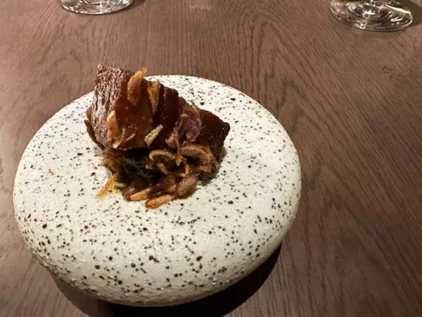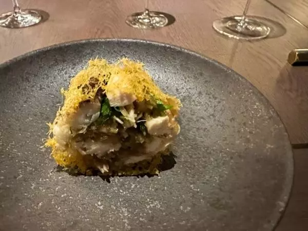 卵料理として出されたのは、カラメルココナッツと蟹を卵のネットで包んだもの。食感の面白さとカラメルの甘さが特徴です。これは黄色、甘み、そして揚げでしょうか。