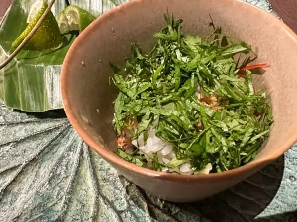 次は少し塩辛いライスサラダで、タイ南部で食べられているスタイルだそうです。ライムをしぼっていただきます。確かに南っぽい感じはします。色は緑、味は辛み、調理法はライスだから蒸すですね。