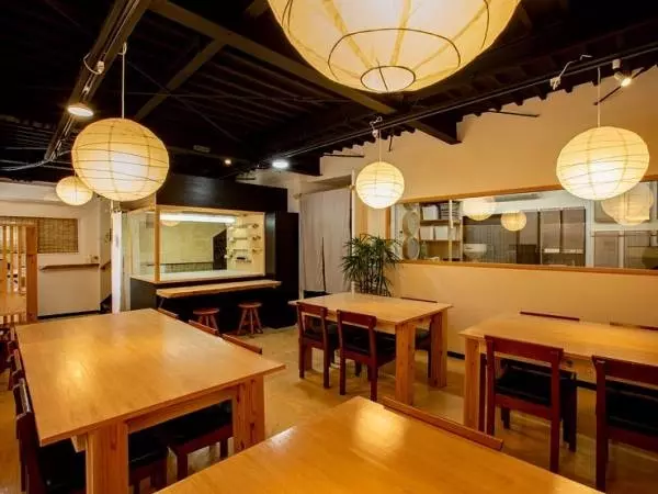 駅から徒歩圏にありながら、都会の喧騒を忘れる落ち着いた風情。外装には御影石の敷石、吉野杉でつくられた特注の格子戸など、和のおもてなしへのこだわりが感じられます。店内も木のぬくもりと清潔感を感じる和みの空間。オープンキッチンも備え、タイミングが合えば目の前で蕎麦打ちが見られます。