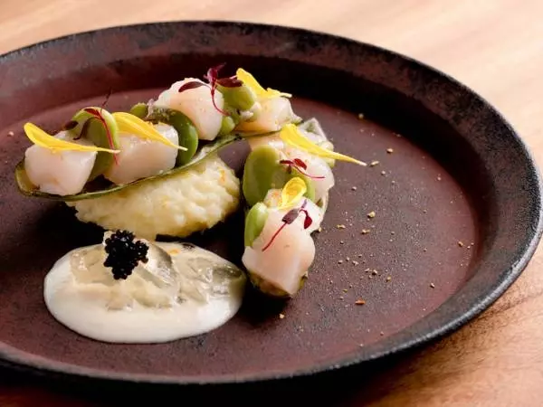 ある日のランチメニューの『空豆とホタテのマリネ~かつおのジュレ』。メニューは仕入れ状況で変化する