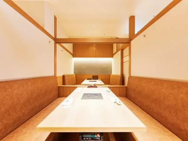 4名用と6名用の半個室をメインとした店内は、シンプルで落ち着いた雰囲気。仕切りを取り外すことで最大14名までの利用が可能です。豊富な飲み放題メニューをプラスですれば、気の置けない仲間と存分にお肉を満喫することができるはず。『贅沢飲み放題プラン』なら多彩な日本酒も飲み放題OKです。