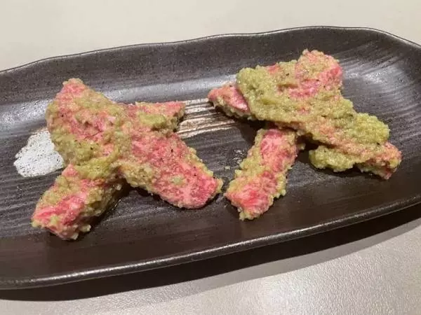 黒毛和牛の、サシと赤身のバランスが絶妙な「シンシン」という部位を使用。わさびを塗って焼き上げたら、相性のいい醤油と一緒にいただきます。わさびの香りと鼻に抜ける心地よい辛味、醤油の風味が相まって、ご飯もお酒も進む大人の一品です。