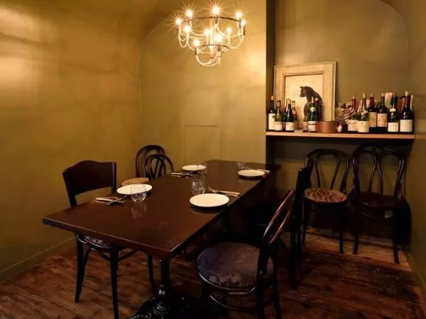 螺旋階段横にある木製のドアを開けると、料理と同じくシンプルでセンスを感じられる空間が広がっています。クラシックな木の床とテーブルが印象的な店内には、半個室のスペースも完備。席の間隔もゆったりとしているので、リラックスして料理を楽しむことができます。