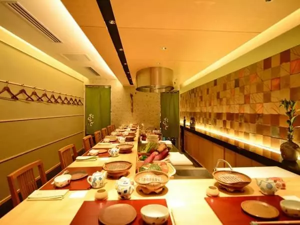 カウンターのみの店内を彩るのは備前焼のタイル。食器も備前焼でそろえるなど、目にも楽しい演出が施されています。眼前で次々と揚げられていく天ぷらと合わせるのは、お手頃から最高級品までの常時約50本のワイン。魚介類との相性は白ワインやシャンパンがオススメです。