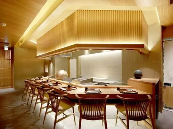 2台ある天然欅のカウンター席を格子の扉で区切ったスタイリッシュな店内は、銀座とは思えないほどの静けさ。オープンキッチンから、天ぷらを揚げる心地よい油のリズムが満ちています。壁面にタイルや錫、床に石材をめぐらせた店内の設えも魅力的。海外からのゲストにも大好評です