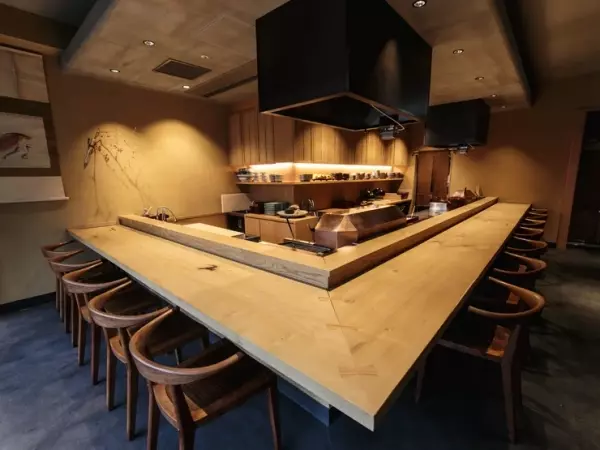 オープンキッチンのカウンター席を中心に、大切な場面で利用したい個室2部屋を備えた店内は、白木が照明に浮かぶ洗練された空間が自慢です。