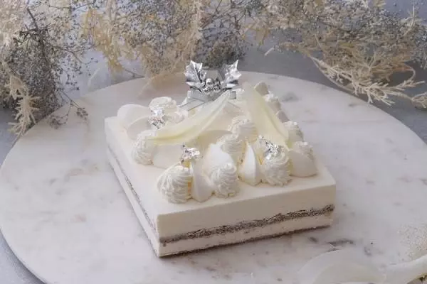 縦12㎝×横14cm(3~4名様用)6,500円。口どけの良いなめらかなマスカルポーネチーズのムースを使用し、ティラミス風に仕上げたクリスマスケーキ。雪が積もったような真っ白な世界感を表現しました。