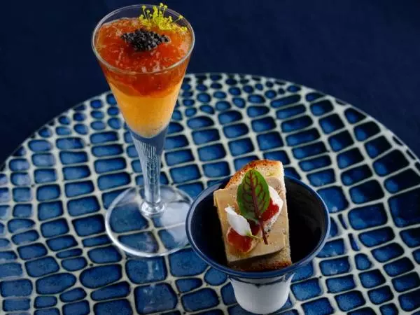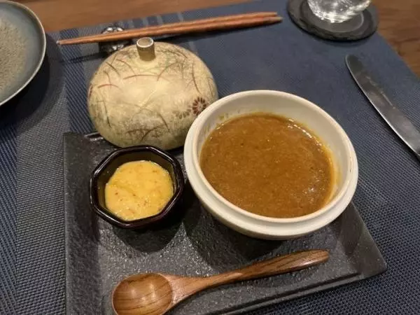 唯一変わらずに作り続けているという一品。甲殻類、貝類、塩は使わずにスープを仕立てているので、甲殻類アレルギーの方でも楽しむことができます。ほかでは味わうことができないオリジナルレシピは、和の焼き物の器も素敵です。