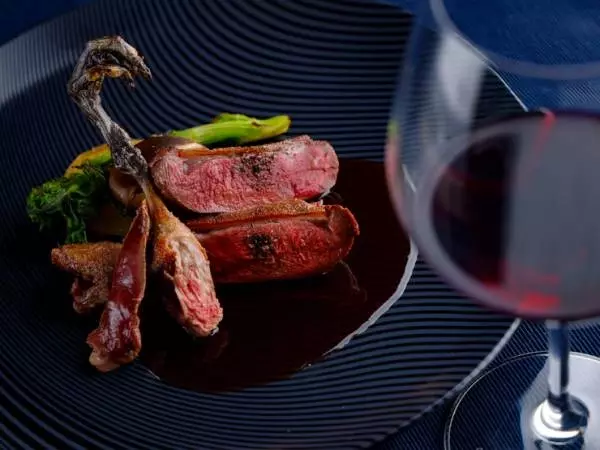 肉を炭火でローストした、盛付けも美しいメイン料理。炭火で火を入れることで、水分が抜けて凝縮された肉の旨みや、炭の香りが広がります。じっくりと噛みしめて味わうごとに、肉本来のおいしさが伝わる一皿。滋味深い味わいを、相性のいいワインと共に。