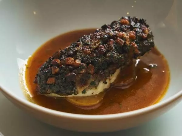 そのままスープとしても出せる力量の味ながら、廣田シェフは贅沢にもソースに使用。カサゴにはヤリイカやシャンピニオンのデュクセル、そして刻んだほうれん草やクルトンを合わせて乗せ、オーブンで焼き上げている。「カサゴをぐしゃぐしゃにしてソースと合わせて食べてみてください。」とは廣田シェフ。