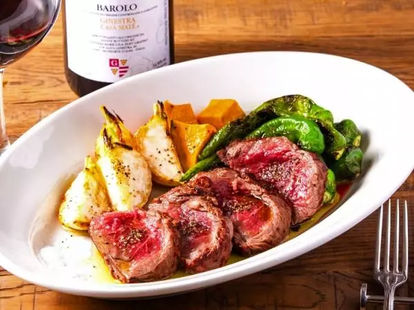 脂肪が少なく旨みが強い上質の赤身肉「ランプ」をシンプルかつ豪快に炭火で焼いた一品。【グラツィオーゾ】の真骨頂が味わえる一皿です。表面はこんがりと、切り口は美しいローズ色のレアで仕上げた焼き具合も絶妙。たっぷり添えられた旬の野菜のおいしさにも感動します。