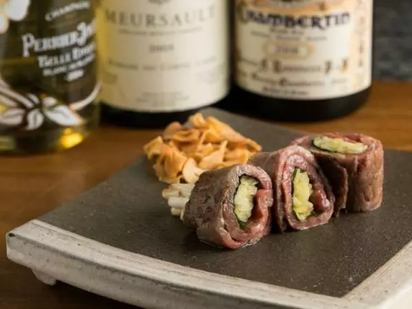 写真の黄ニラなど、旬の野菜を牛肉で巻き絶妙な火入れで仕上げる『和牛サーロインうす焼 130g』
