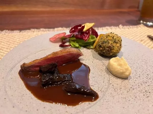古き良き風情の漂う商店街に2023年にオープンした【e’troit】。地元で独立した料理人の池田さんは、東京やパリの名店で研鑽を積んだ腕前の持ち主。正統派フレンチを軸に、オリジナルのアレンジを加えた料理をコースで楽しめます。完全予約制の『季節のおまかせコース』で、地元産が中心の食材やフランス産ジビエなどを駆使した料理をじっくりと堪能して。