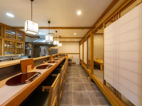 木の温もりあふれる和の空間で、紅葉の余韻に浸りながらくつろげます。日本料理と相性のいい日本酒や焼酎はもちろん、ワインも用意。全20席の店内には、目の前で腕をふるう料理人の姿を眺めながら食事が楽しめるカウンター席や、くつろげる座敷席があります。また、個室もあるので家族や仲間と特別な時間を過ごしたいときにオススメです。