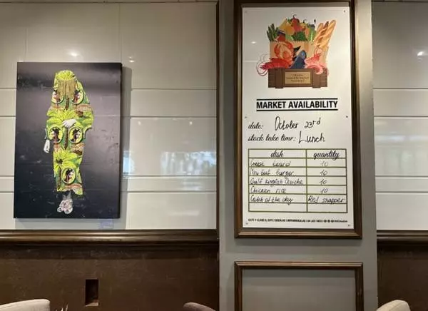 さてその【ボカ】は、街の中心にあり、地中海とりわけスペイン料理の趣が強いレストラン。ランチタイムはサラリーマンで賑わっています。ところどころに優しい緑が配されていて、今日の仕入れ状況が壁に掛けられています。壁は若いアーティストの発表の場としても利用され、様々なアートが天井にまでかけられています。