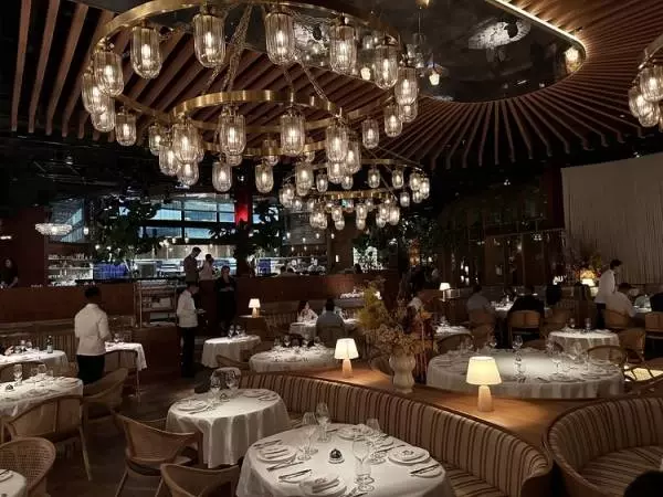 オープンキッチンの燃えさかる炎と、現代風のシャンデリアの対比がユニークで、ニューヨークなどの大都会の社交場といった趣です。