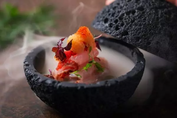 高級魚をさらにおいしく、楽しいプレゼンテーションで届けるのが【華あざ】流。写真の例は、皮目を香ばしく炙った金目鯛を桜チップで瞬間燻製。目の前でフタが開くと、幻想的な煙の中から歓喜の美味が登場!