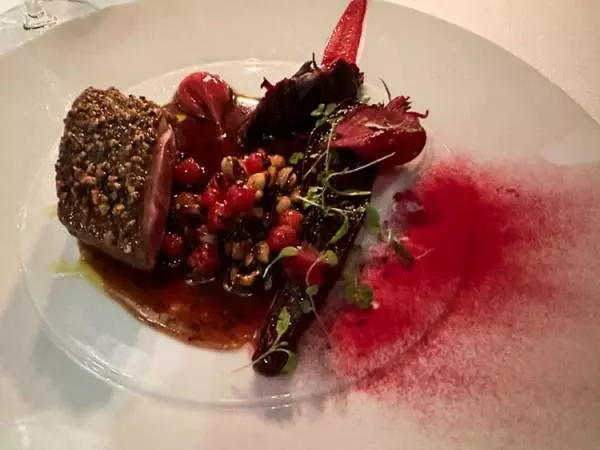 そしてメインにはもちろん鴨をいただくのですが、幼鴨はブルーベリーやビーツの赤いソースで彩られ、酸味がしっかり効いた今風のものでした。やはりおいしい。40年前に感じた衝撃ではなく、今回は「ここに帰ってきたんだ」といった懐かしさを感じました。噛みしめるたび、時の流れがじわじわ、ひしひしと迫ってくるようで、素晴らしい時間を過ごすことができました。
