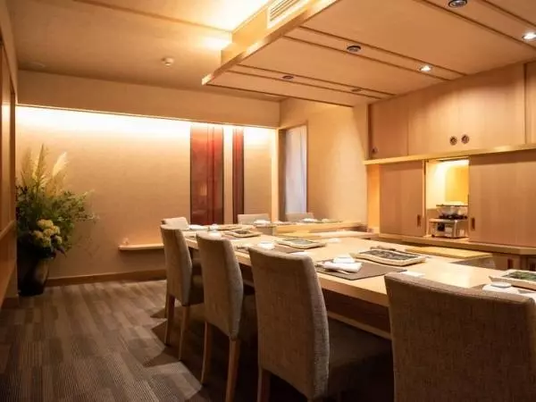 ビルの3Fにある秘密基地のような鮨店。ゲストにだけ知らされる暗証番号で入店するシステムも、非日常感を生み出しています。店内は、黒で統一された和モダンな雰囲気で、カウンターは樹齢150年の「吉野桧」を使った立派な造り。料理がさらに美しく映えるよう照明を配するなど、細部にまでこだわりが光る大人の空間です。
