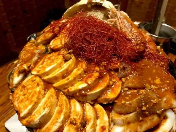 山盛りの海鮮とあん肝の迫力! 味もインパクトも抜群の『新!痛風鍋赤』