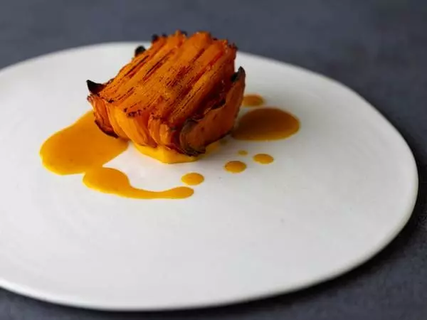 味わいだけでなく瓢箪のような曲線、オレンジの色合いなどバターナッツの個性を愛でつつ、表面はカリッ、中はねっとりのコントラストも楽しめる一皿