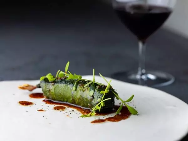 蕗のペーストを表面に塗った小さな鶉を蕗の葉で巻いてロースト。実山椒の香りをつけたフォンドボーソースで