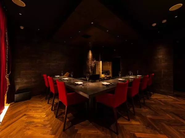 店内は黒と赤をベースにしたモダンな空間。非日常を感じさせるデザインでありながら、落ち着いて食事が楽しめるスペースになっています。カウンター席からは種類豊富にとりそろえられたワインが並ぶセラーを眺めることも可能。接待や会食など、ここぞというシーンで使いたいお店です。