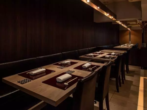 接待などのビジネスの場にも重宝する、テーブル席も用意。4名用3卓がセッティングされていて、カウンター越しに料理人の仕事を眺めることもできます。