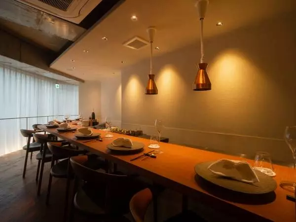 路地裏に佇む隠れ家のような同店。店内は、左官仕上げの白壁や木、土や石など自然の素材で設えられています。シェフの気遣いが行き届くように、店内はカウンター8席のみ。リラックスした雰囲気に包まれ、それぞれのペースでお料理を満喫できるので、大切な人と特別な時間を過ごすのにぴったりです。
