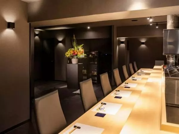 店内は上品でシンプル、ゆったりとした非日常を感じる優雅なつくり。目の前で調理の様子を見ることのできるカウンター席は広々とした空間になっています。個室も用意されているので、食事会や接待などにも対応可能。コース料理に合わせたワインや日本酒も用意されるなど、さまざまなニーズに応えてくれます。