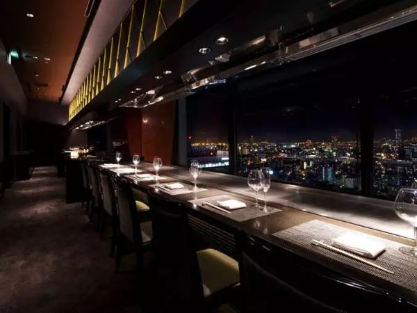 【ホテルモントレグラスミア大阪鉄板焼神戸】は、難波駅から徒歩1分というアクセス抜群の立地。お店はホテル22階にあり、シックでくつろげる店内はカウンター12席のみという贅沢な空間。大きな窓から一面に広がる絶景が、デートを盛り上げてくれます。