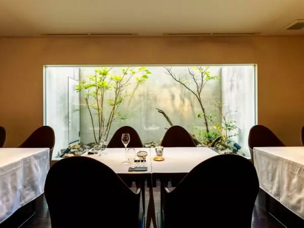特別な日を過ごす場所にふさわしく、ぬくもりある扉の向こう側には、日常を忘れさせる上質な雰囲気が漂っています。大地をテーマにした店舗には時間とともに表情を変える坪庭があり、心まで満たされる極上の時間を過ごせます。ライトダウンされる夜も素敵。ラグジュアリーな雰囲気の中、美酒と美食を楽しめます。