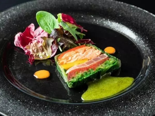 味はもちろん、目でも楽しませてくれる『スモークサーモンと鮪のテリーヌサラダ添え』
