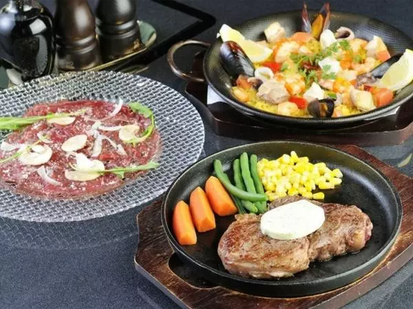 各テーブルにある陶板で、ゲスト自身でお肉を焼いて楽しめるメニューのほか、イタリアンの小皿料理も約20種が揃います。観覧車orスカイガーデンペアチケット&デザートプレートプレゼントの付く、全8品からのコースもオススメです。