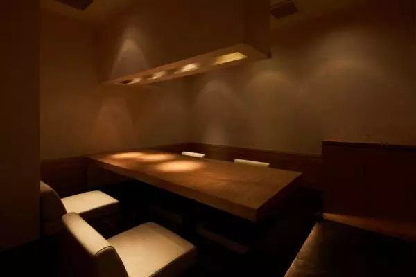 客席は、カウンターの他に、プライベートを大切にした個室を用意。4名まで利用できる個室は、木目が美しいデザインを成す橡の木でつくったテーブルが印象的。掘りごたつ式なので、靴を脱いで寛いだ時間を過ごすことができます。個室専用のトイレを完備しているのも嬉しいところ。