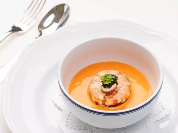 大竹ICから車で5分の場所に店を構える【SIMOSE French Restaurant】。提供するのは、広島県産のトマトを使ったスペシャリテ『車海老とトマトのゼリー寄せ 赤ピーマンのソース』など、地元の食材をふんだんに味わえるフレンチメニュー。