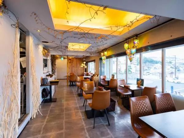 お店があるのは、宮島行きフェリー乗り場からすぐのビル2階。店内は、ドライフラワーやトルコランプなどがディスプレイされた非日常的空間です。明るい日差しが差し込む窓際には数多くのテーブル席を設置。港を見渡せる、抜群の眺望を思う存分楽しむことができます。
