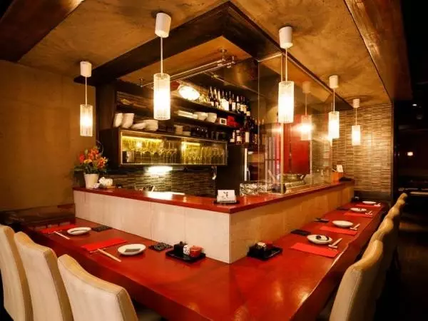 北新地駅から徒歩3分の場所に店を構える【びすとろ炭火焼一星】。和の雰囲気漂うエントランスから足を踏み入れれば、高級感のある空間が広がっています。店内にはカウンター席、テーブル席のほか、大小3つの個室に半個室も完備。深夜2時までゆっくりと、おいしい食事を楽しめます。